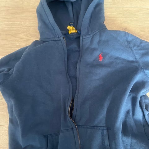 Polo Ralph Lauren hettegenser for gutt i størrelse 152. Hettegenseren er i blå bomull og har glidelås foran.