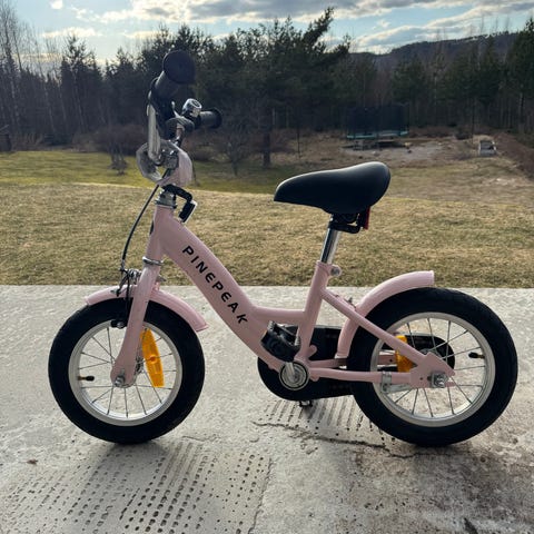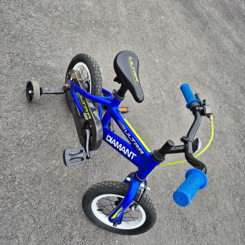 Diamant barnesykkel med 12" hjul og håndbrems. Den er utstyrt med støttehjul.