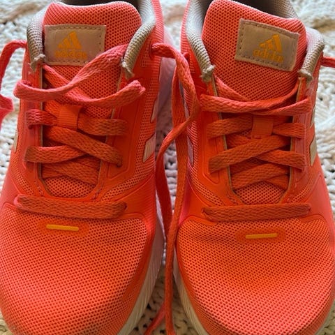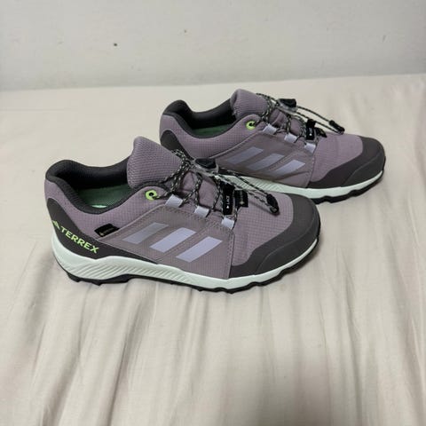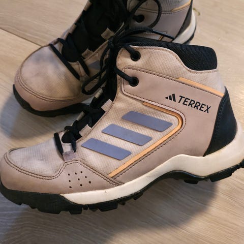 Adidas Terrex sko i størrelse 33. Skoene har overdel i tekstil og syntetisk materiale i lilla med gule detaljer, samt snøring foran for justerbar passform. Yttersåle i gummi gir godt grep. Egnet som hverdagssko og til lett uteaktivitet for barn.