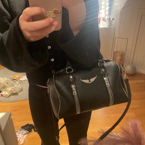 Nunoo skinnveske i svart lær. Vesken har doble bærehåndtak og avtakbar skulderrem med kjettingdetaljer i metall. Hovedrommet lukkes med glidelås, og det er en utvendig glidelåslomme på fronten for mindre eiendeler. Passer til daglig bruk, med plass til nødvendigheter som lommebok, mobil og nøkler samt en genser.