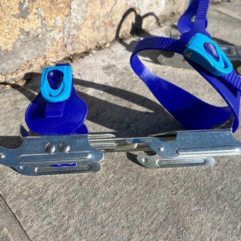 Skøytene festes utenpå sko ved hjelp av justerbare lærreimer med spenner