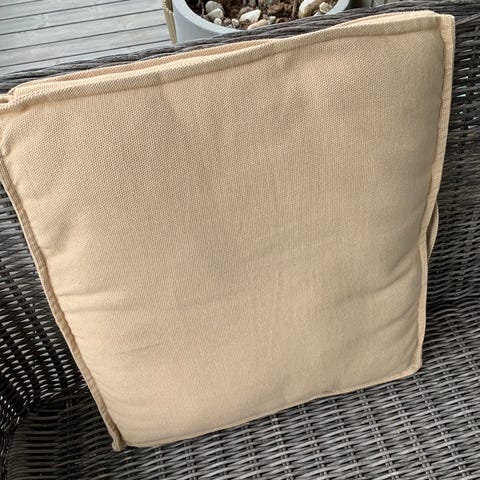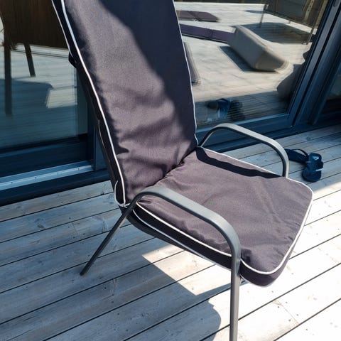Stolpute med nakkestøtte i rutete mønster i blå og beige nyanser. Putens form og lengde er tilpasset høy rygg på hagestol eller loungestol. God kvalitet , nesten ny . 200kr par stikk