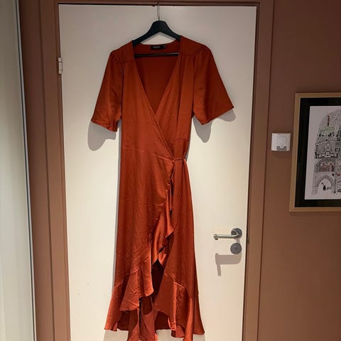 Nydelig kjole, brukt én gang. Vakre rysjer nederst. Bundet under brystene, polyester