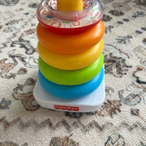 Fisher-Price stableleke med ringer i plast. Leken består av en hvit base med en gul stang og fem store, fargerike ringer som kan stables i ulike rekkefølger. Øverste ring har gjennomsiktig topp med små kuler inni. Produktet er laget i hard plast og er egnet som aktivitetsleke for små barn for trening av finmotorikk, fargegjenkjenning og hånd–øye-koordinasjon.
