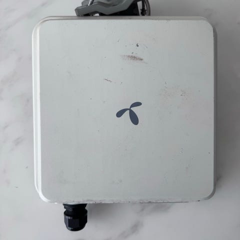 Enheten er beregnet for montering utendørs og har veggbrakett og fastmontert kabel, slik at den kan plasseres på yttervegg eller lignende for bedre mottak. Modellen støtter 5G-mobilnett og fungerer som ruter for å levere internett til nettverket ditt via mobilforbindelse.