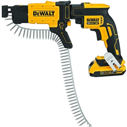 DEWALT 18V XR Børsteløs gipsskrutrekker for effektiv montering av gipsvegger. Kraftig børsteløs motor med 4 400 o/min trekker skruene effektivt og gir optimal brukstid i ett kompakt verktøy. Kommer til på trange steder. Hurtigutløsende skruemagasin til skruebånd som passer til de fleste skruetyper. Enkel skruemagasinåpning for rask fjerning av gipsstøv. Set and forget-funksjon husker finjusteringen av dybden når du bytter nesestykket. LED-arbeidslys lyser opp områder med begrenset belysning. Vinklet beltekrok kan festes både på venstre eller høyre side av maskinen. Ergonomisk utformet gummigrep for høy komfort.