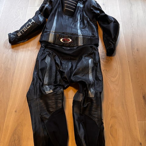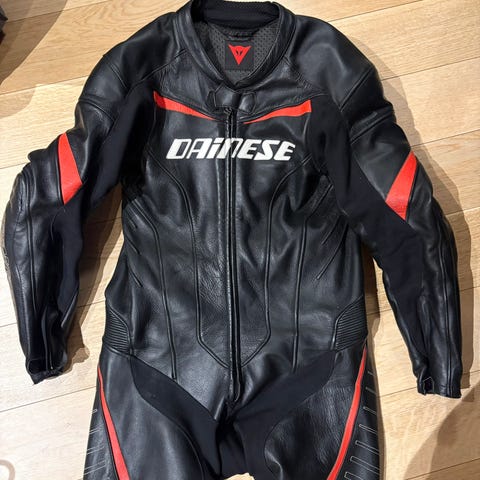 Dainese mc-dress i skinn i todelt modell med jakke og bukse som kan kobles sammen med glidelås i livet. Farge svart. Størrelse 52. Jakken har beskyttelse i skuldre og ryggparti, og perforert innerfôr for ventilasjon. Buksen har forsterkninger og knepartier tilpasset kjøreposisjon. Egnet til motorsykkelkjøring på vei og bane der det er behov for heldekkende skinnbeskyttelse.