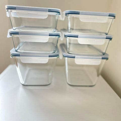 IKEA glassbokser med lokk til matoppbevaring. Settet består av flere runde og firkantede beholdere i klart glass med gjennomsiktige plastlokk med klips og tetningslist.