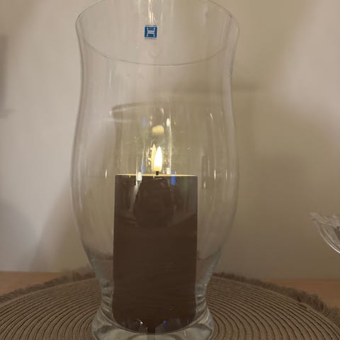 Stor vase fra Hadeland, kan også brukes som lyslykt. Sandblåst merke under bunnen, «Folkehelseinstituttet» med logo. Synes ikke når vasen er i bruk! Høyde 27 cm.