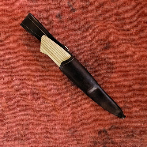 Ny håndlaget kniv til salgs (ref. 293). Bladet, som er 85 mm langt, er råsmidd og har falsk egg og er håndsmidd av knivsmed Jan Petter Dalen. Skaftet er laget av stabilisert Japansk ask og har ilegg av vulkanfiber og sølvtinn. Slira er sydd av masurlær fra Jørn Jensen lærhandel.