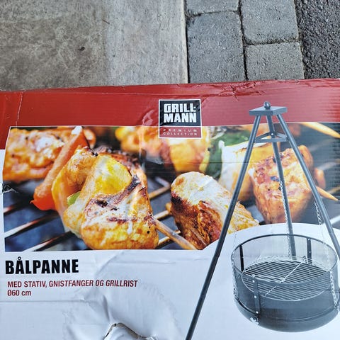 Bålpanne på stativ i svart metall. Modellen har tredelt stativ med kjettingoppheng for bålpannen. Selve pannen er rund med nettingvegger og bunn, samt grillrist på toppen. Egnet til bruk som bålpanne og enkel grill i hage eller på hytte. Kan fyres med ved eller grillkull etter behov.