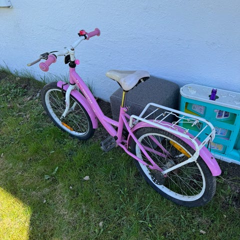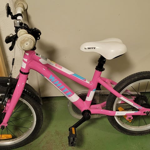 White lite xc barnesykkel 16" i rosa med hvit sal. Sykkelen er pent brukt og alt funker som det skal bortsett fra sykkelstøtta som mangler en skrue. Passer barn 4-6år.