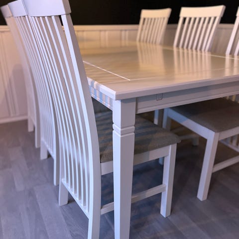 Det følger med 2 ileggsplater som festes på hver ende av bordet. Blir da plass til 12 rundt bordet.