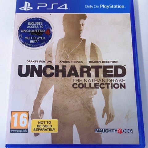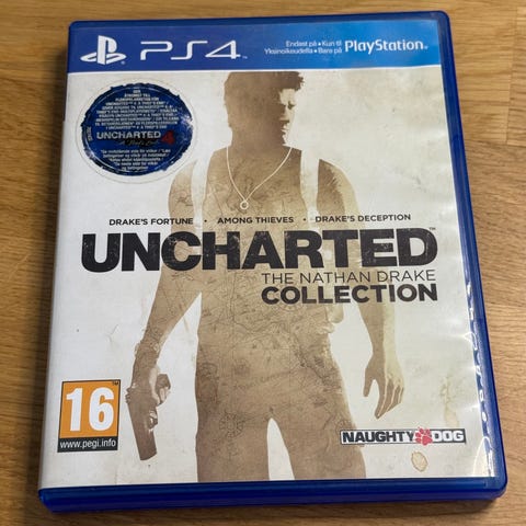 Selger Uncharted: The Nathan Drake Collection til PS4. Dette er en samling av tre klassiske spill: