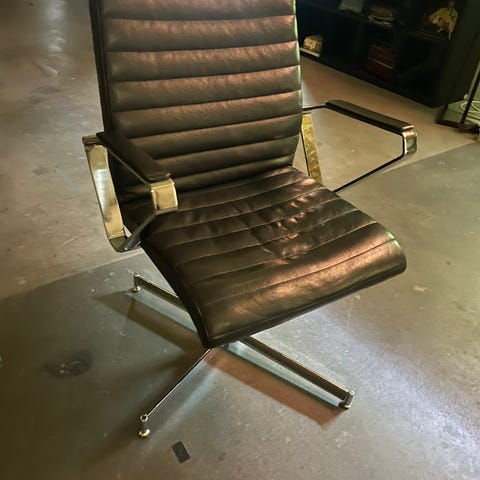 Loungestol Erik Jørgensen i sort skinn. Svingbar. 4 ben. Sittehøyde 42 cm, total høyde 96 cm, bredde rygg 70 cm, diameter sittepute 55 cm.