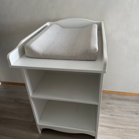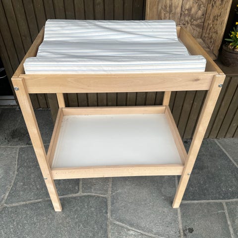 IKEA stellebord med integrert babybadekar og oppbevaringshyller. Rammen er i lyst treverk, med to tekstilkurver i hvit farge under til bleier, klær og utstyr. Øverst er det en stelleflate med stellematte (tykk stellematte følger ikke med), og under denne et uttakbart plastbadekar (følger med) til bading av baby. Dette stellebordet har ikke hjul, men har lagt ved bilder av lignende stellebord for å vise badekaret. Egnet til stell og bading av spedbarn og små barn, med praktisk oppbevaringsplass lett tilgjengelig under stelleflaten. Selges demontert for å lettere fraktes.