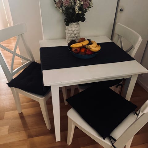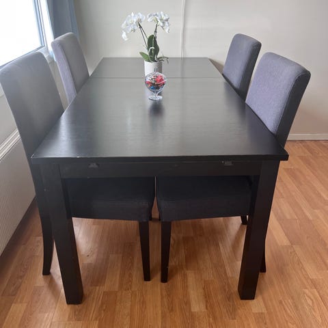 IKEA spisebord med stoler i svart og hvit. Rektangulært spisebord med mørk bordplate og rette ben. Seks polstrede stoler med trekk i hvitt stoff med svart blomster- og plante-mønster, og mørke stolben. Passer som spisegruppe i kjøkken eller spisestue. Designet av Alberto Meda.