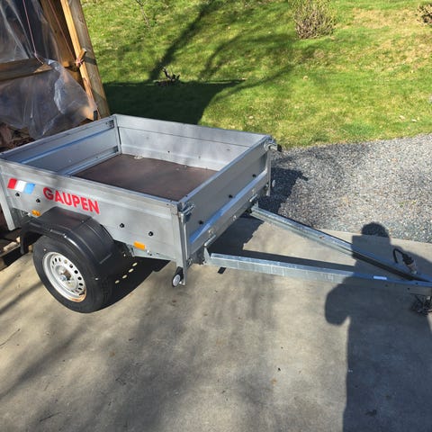 Gaupen tilhenger med totalvekt 750 kg. Egenvekt er 165 kg og nyttelast 585 kg. Hengeren har innvendig lengde på 3300 mm og bredde på 1510 mm. Utstyrt med lys bak og nesehjul foran. Egnet til transport av ulike typer last innenfor oppgitt vekt og størrelse. 190 lengde. 150 bred. Ikke spør om prisen !