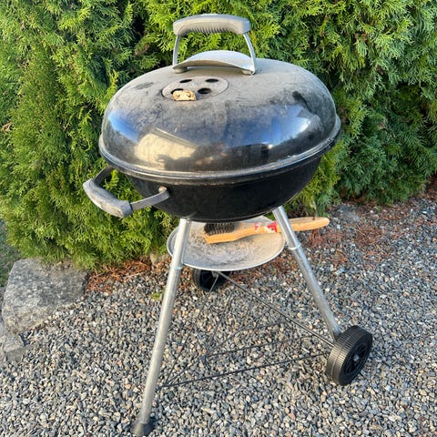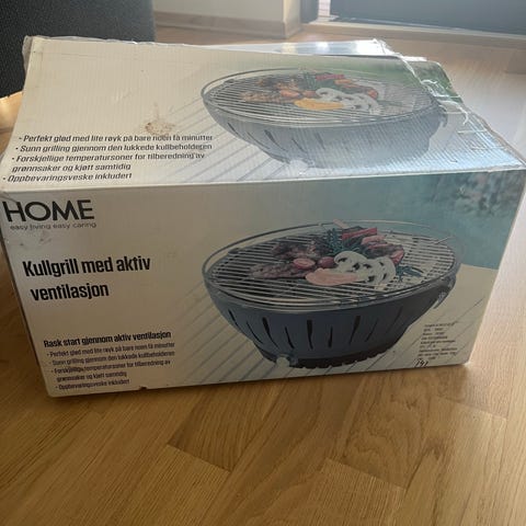 Kulegrill i metall med rund grillrist og kullbeholder. Grillen står på tre bein, hvor to av beina har hjul for enklere forflytning. Under grillbollen er det en metallplate som fungerer som askefanger. Håndtak på siden for å løfte og flytte grillen. Egnet for kull eller briketter til utendørs grilling.
