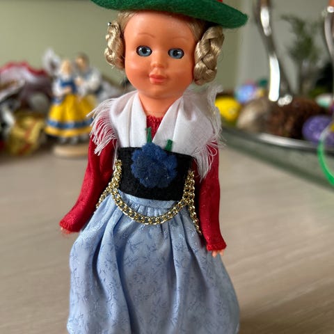 Nydelig dukke , porselensansikt og hender, med flotte klær og støvler. Dukken er 18 cm høy
