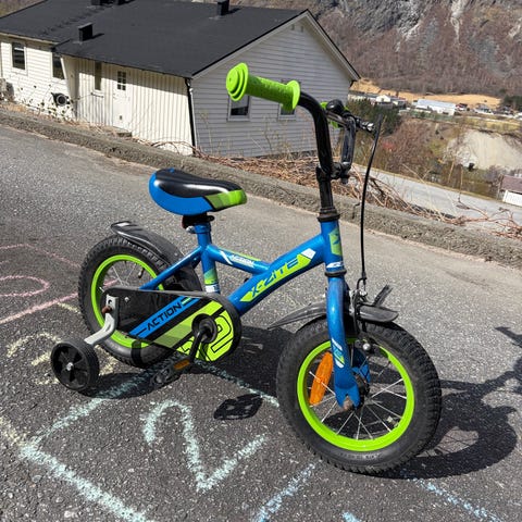 X-Zite Action barnesykkel med 12" hjul. Sykkelen har ramme i stål, støttehjul og kjedekasse. Den leveres med felgbrems foran og fotbrems bak. Sete og styre kan justeres i høyde for å passe barn som bruker 12" barnesykkel. Fargen er blå med grønne detaljer.kjøpt ny i april ifjor så veldig pent brukt