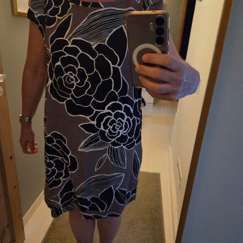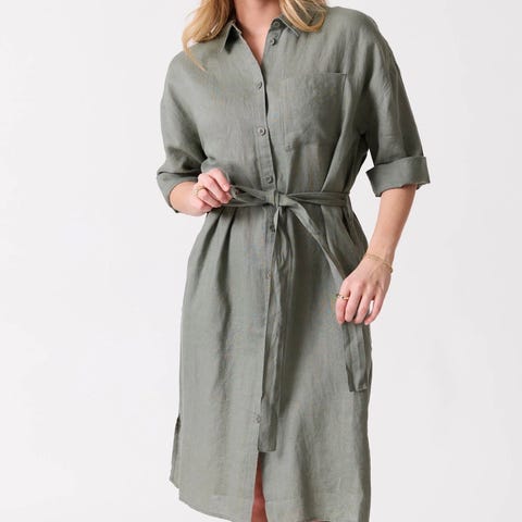 Skjortekjole i behagelig linblanding. Kjolen har frontknepping, 3/4 erm med hempe og oppbrett med knapp, knytebelte, splitter i siden og fold i ryggen. Kjolen kan brukes med og uten belte.