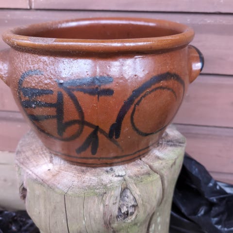 Sett med to keramikk krukker /potter i brunt med håndmalt dekor i mørkere brun. Begge krukkene har små hanker på sidene. Den ene krukken er noe større enn den andre.