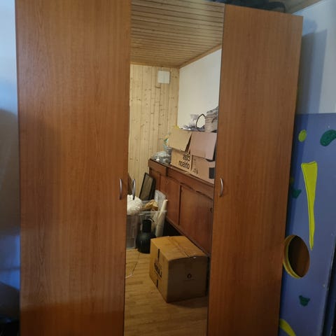 Høyskap med 2 glassdører og en midtseksjon med hyller og skuffer, uten føtter gies bort. Må hentes hos selger.