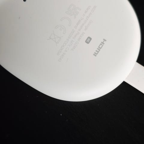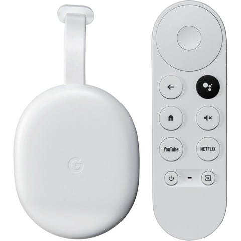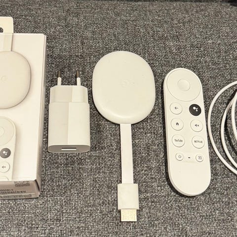 Google Chromecast 4k (Google TV) med fjernkontroll. Strømmingsenhet som kobles til TV via HDMI. Fjernkontrollen har gul gummi deksel. Leveres med USB‑kabel for strømtilkobling, men ikke lader.