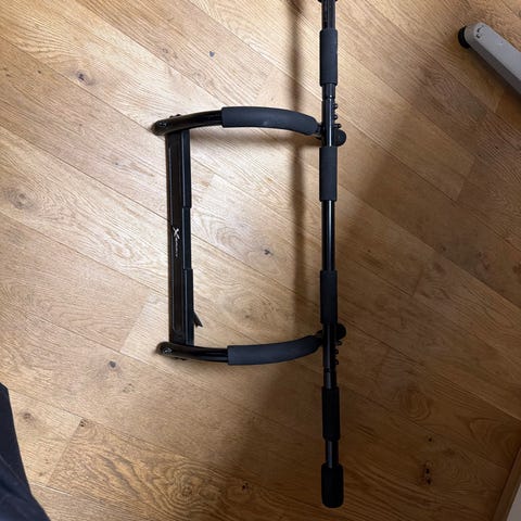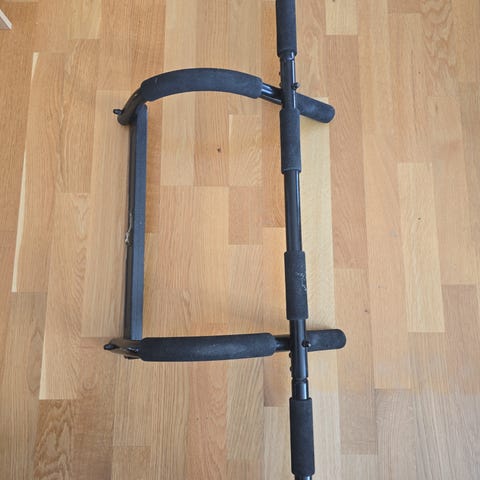 Dørstang treningsapparat som kan brukes til pull-ups, chin-ups, push-ups og lignende øvelser. Apparaten festes i dørkarmen og har polstrede håndtak for bedre grep og komfort. Egner seg til hjemmetrening og kan enkelt tas ned og legges bort når det ikke er i bruk.