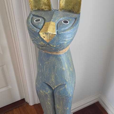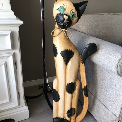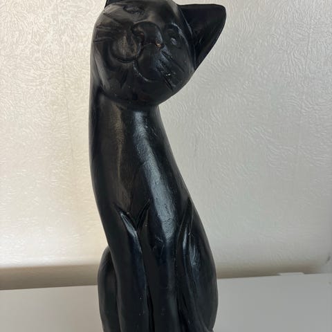 Dekorative kattefigurer i tre i svart farge. Sett med fire figurer i ulike høyder, to høye og slanke og to mindre. De største figurene har utskårne detaljer i ansiktet med kontrastfarger, mens de minste har et enklere formspråk. Passer som interiørdekorasjon på bord, hylle eller i vinduskarm. Materiale fremstår som malt eller beiset treverk med utskårne detaljer.