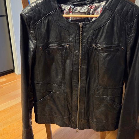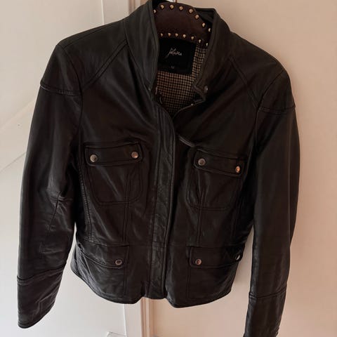 Jofama kort og tøff skinnjakke (ekte skinn) for dame i størrelse 42. Jakken er laget i svart skinn med glidelåslukking foran.