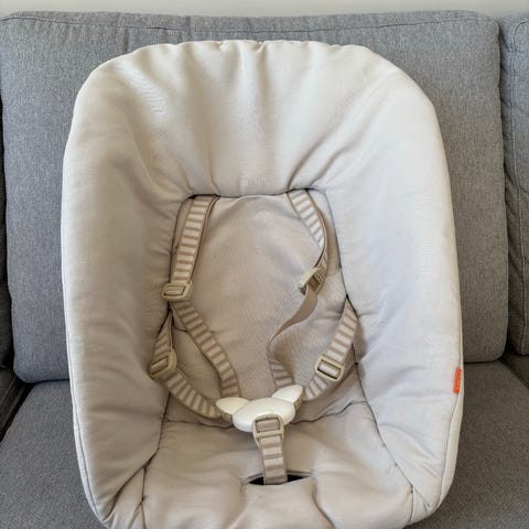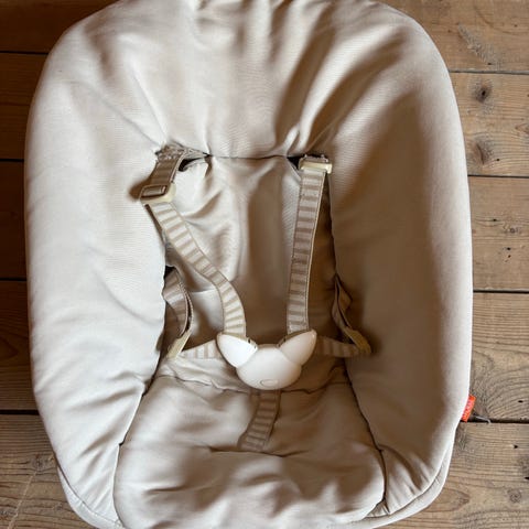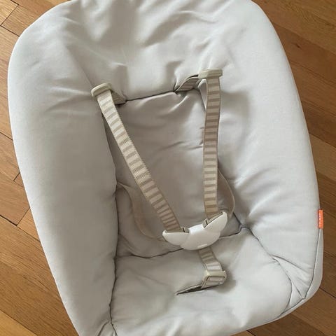 Stokke Tripp Trapp Newborn barnesete for bruk på Tripp Trapp-stol. Settet består av plastskall med polstret trekk og integrert sele for spedbarn. Det følger med et ekstra trekk som vist på bildene. Produktet er beregnet for nyfødte og frem til barnet kan sitte stødig selv. Dette er en modell med kun ett nivå/stilling på setet.