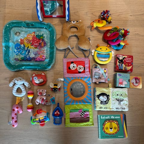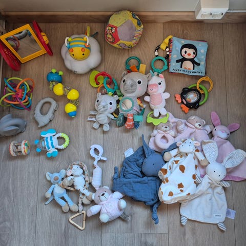 Lekepakke med babyleker selges samlet for 250kr. Det er forskjellige merker.