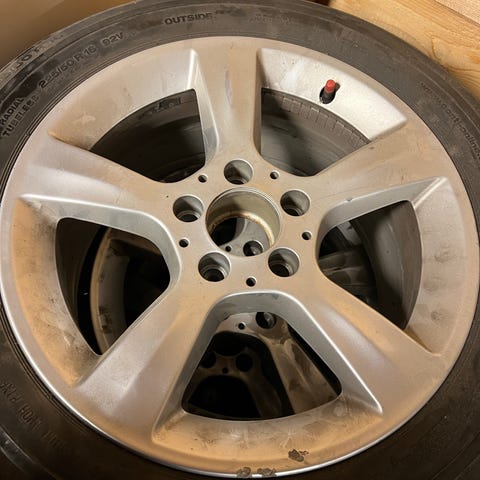 Mercedes C-type 2003 mod felger med gamle ubrukbare dekk. 5 112 boltsirkel, 66.6 sentrerhull. (Trolig også brukbar på Skoda og VW med sentreringsting.) Kr 900 for 4 stk.