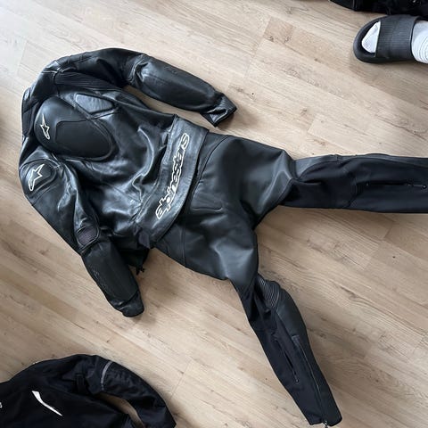 Spidi motorsykkel skinndress for herre i størrelse 56. Dressen er todelt med jakke og bukse som kan kobles sammen med glidelås. Utført i svart skinn med forsterkede felt og polstring på utsatte områder som skuldre, albuer og knær. Perforert innerfôr for bedre ventilasjon. Egnet til bruk på vei og bane for førere som ønsker en hel skinnløsning med beskyttelse og god passform.