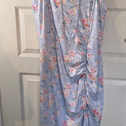 NA-KD Amika Teller sommerkjole i størrelse 36. Kjolen er i polyester med flerfarget blomstermønster i rosa og grønne toner på lys bunn. Modellen har tynne stropper, dyp utringning foran og knyting i ryggen med utskjæring. Skjørtet er lett og lagdelt for et luftig uttrykk. Passer som sommerkjole til hverdagsbruk eller anledninger i varmt vær.