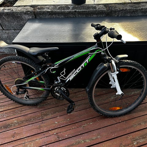 Scott barnesykkel med 24" hjul. Sykkelen dempegaffel foran, felgbremser og gir foran og bak. Fargen er hovedsakelig hvit med grønne detaljer. Utstyrt med skjermer, støtte. Egnet som barnesykkel til hverdagssykling og turbruk på vei og lett grus.