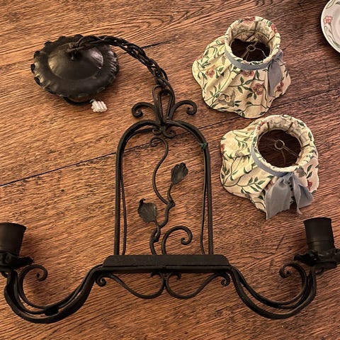 Stålampe 170cm høy, har fire hakk som du kan stille høyden ned på. Liten jerngryte ble brukt til askebeget når røyking var vanlig inne.
