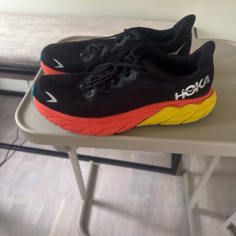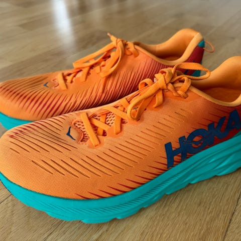 Hoka Bondi X løpesko i størrelse 44. Nyprisen på denne skoen er rett under 3000 kroner. Lett brukt spå mølle inne. Karbonsåle. Har ikke brukt de mye, da de ikke har passet veldig bra til foten min. Skoene har oransje overdel med røde og lyseblå detaljer, samt hvit mellomsåle og yttersåle med oransje gummipartier. Modellen er laget for løping og har en kraftig mellomsåle som gir dempet steg. Overdelen er i pustende tekstil med snøring for justerbar passform. Egner seg til løping og annen trening på hardt underlag.