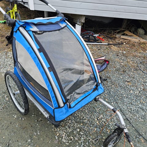 Godt brukt sykkel vogn ca 4 år gammel. Siste året bare vært i boden. Noen skrammer her og der. Anbefalt vekt 30 kg totalt. De står 40 kg men alt for mye…