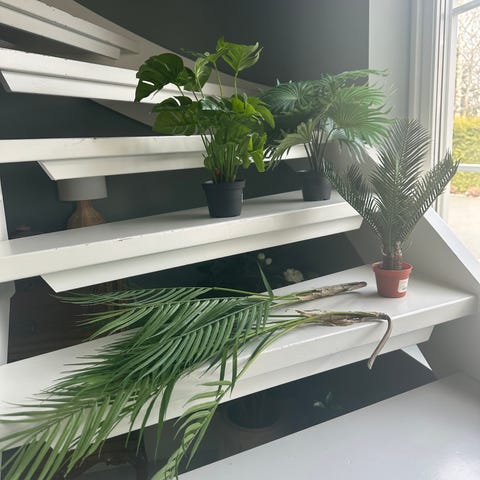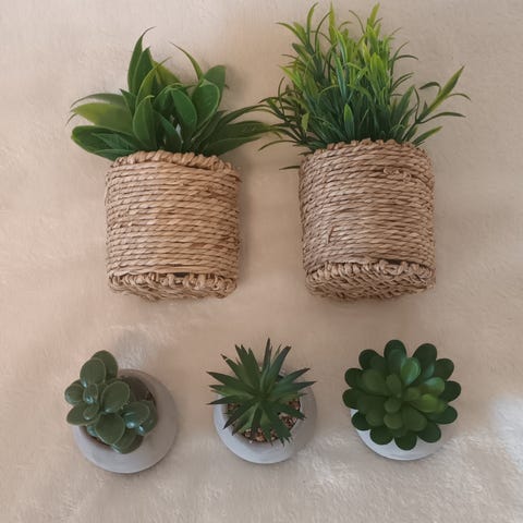 4 små kunstige grønne planter og 4 rotting-potter med plast innerpotte. Selges samlet.