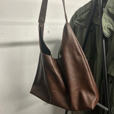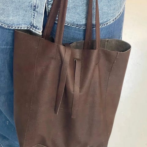 Vesken bæres over skulderen med justerbar stropper- signaturknuten kan løsnes for å forlenge stroppen og tilpasses ønsket lengde. Lukkes med magnet.