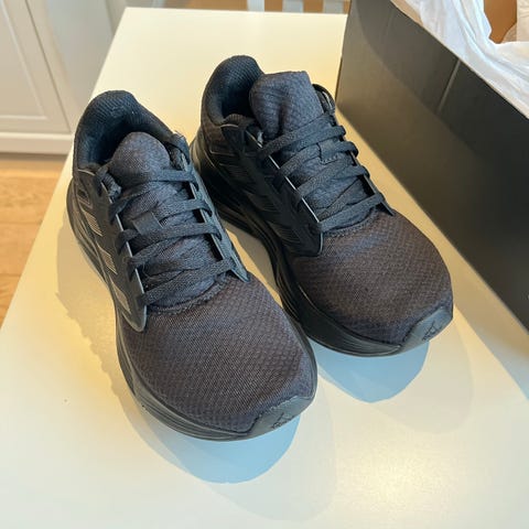 Adidas joggesko i størrelse 38. Skoene er lave med snøring og har overdel i hvitt materiale med lyse striper og detaljer. Yttersålen er i gummi med Adidas-logo under. Passer til hverdagsbruk og lett aktivitet. Sportstype oppgitt som fottur.