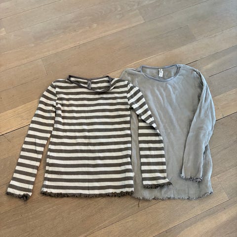 Nøstebarn ullgenser for barn i størrelse 128, unisex. Genserne er laget i ull og har flerfargede striper. Passer godt som innerlag eller mellomlag til hverdagsbruk og uteaktiviteter. Ullmaterialet bidrar til å regulere temperatur og transportere fukt. Genserne har lange ermer og rund hals. På den ene genseren er det et mindre hull, se bilder for detaljert tilstand.