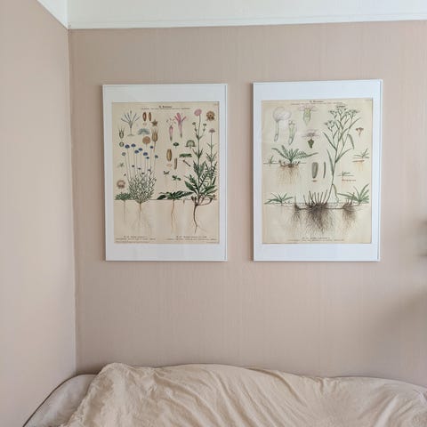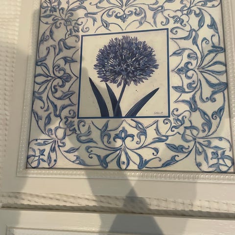 veggbilder med botanisk motiv. Bildene har en lys bakgrunn med blått, botanisk mønster og er innrammet med en enkel, rektangulær ramme. Passer som veggdekor i stue, soverom eller gang. Kan henges sammen som et sett eller hver for seg, avhengig av ønsket uttrykk på veggen. Merke ukjent! Himmel blå farge.