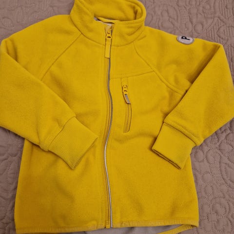 Polarn O. Pyret vindfleecejakke i str. 110. Jakken er lilla og laget i myk fleece som vindtett. Modellen er unisex og har hel glidelås foran, høy krage og ribbede mansjetter. Det er glidelåslomme på brystet og merke på ermet.