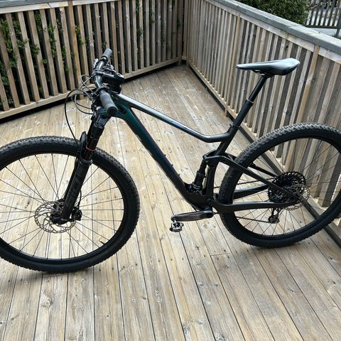 Fulldempa stisykkel, 2016-modell kjøpt ny i 2017. Pga. småbarnslivet og dårlig prioritering har denne stått mest i ro siden den var ny. Har klart å kjøre på den et par riper (se bilde) på de få turene den har vært på, men den er ellers pent brukt.