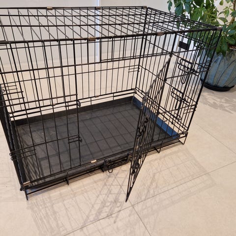 Hundebur i metall i fargen svart. Buret har gittervegger og bunnbrett i plast som kan tas ut for enkel rengjøring. Det har dører med låsemekanisme i front og på siden, og bærehåndtak på toppen for enklere flytting. Egner seg til bruk innendørs eller som hvileplass for hund.