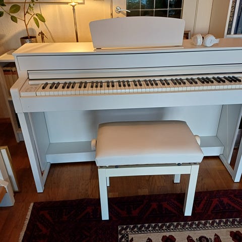 Selger et meget pent brukt Yamaha P-115 digitalpiano i hvit utførelse, med originalt møbelstativ og matchende pianobenk.